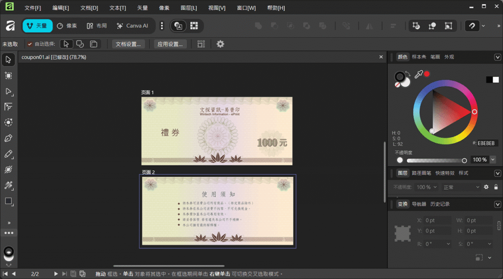 目前 Affinity 的中文版僅支援簡體中文,等一段時間應該會加入「繁體中文」,就像 Canva 平台那樣子。下圖是 Affinity Vector(矢量)匯入 Adobe Illustrator (.ai) 的畫面,看起來跟原始檔案無縫接軌,設計編輯之後可用同樣的 .ai 格式存檔,或是改存成它預設的 (.af) 通用檔案格式。