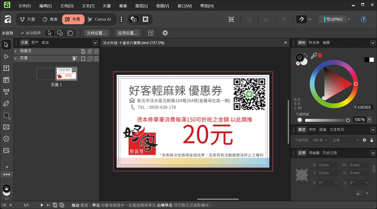目前 Affinity 的中文版僅支援簡體中文,等一段時間應該會加入「繁體中文」,就像 Canva 平台那樣子。下圖是 Affinity Vector(矢量)匯入 Adobe Illustrator (.ai) 的畫面,看起來跟原始檔案無縫接軌,設計編輯之後可用同樣的 .ai 格式存檔,或是改存成它預設的 (.af) 通用檔案格式。