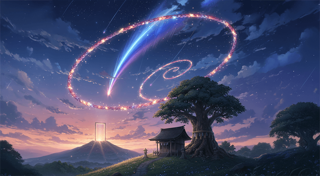 • 動畫聯動: 《你的名字》中的宮水神社世世代代傳承巫女職責。女主角宮水三葉製作的組紐(Kumihimo,編繩)和她獻上的口噛み酒(Kuchikamizake)都是「結び」的具體形式,它們成為連結男女主角跨越時空的關鍵媒介,是古代信仰中「生命與時間循環」概念的浪漫化體現。