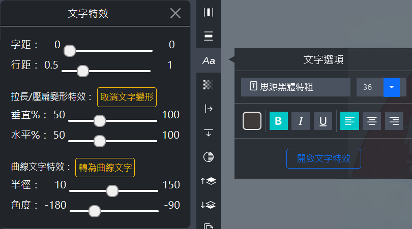 如上圖所示,先選取一個文字框,從「文字選項」按「開啟文字特效」鈕,拖曳半徑或角度的兩個拉桿即可。也可以將一般文字,點選「轉為曲線文字」按鈕,直接將它轉成曲線文字!