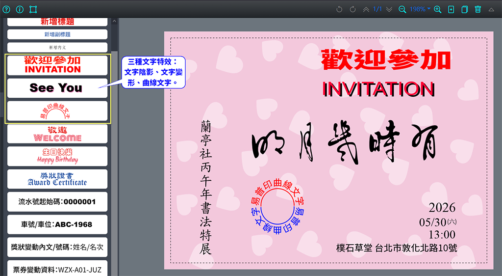 為了讓版面設計上更加活潑多樣,易普印「設計雲」平台跟進 Canva.com 網站,2024 年推出第一個「文字陰影」的文字特效。接著,增加第二個文字特效「文字變形」,文字可以水平或垂直縮放,顯現出文字拉長或壓扁的變形效果。終於在 2025 年底再加入「圓弧/曲線文字」的文字特效,讓文字能夠繞著圓弧形路徑,文字不再只能直線排列了。如下圖所示。
