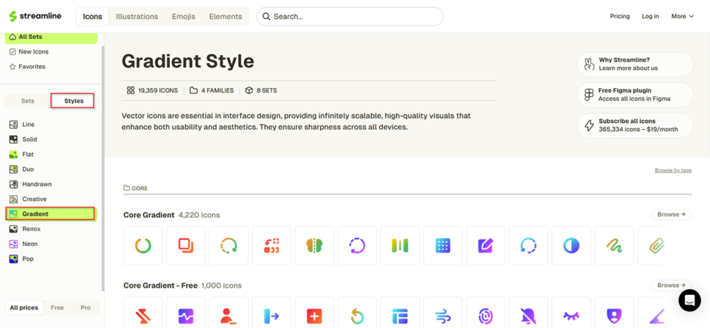 它單純的「圖示 Icon 類」數量就超過 35 萬個,而免費版就超過十萬個以上。圖示 Icon 類目前有 156 組,可從左側的「Sets」挑選想要的素材,通常每一組的圖示又再細分以方便選擇。此外,還提供以樣式「Styles」方式,方便你挑選圖示,例如漸層樣式(Gradient Style),見下圖。