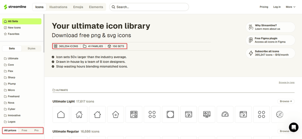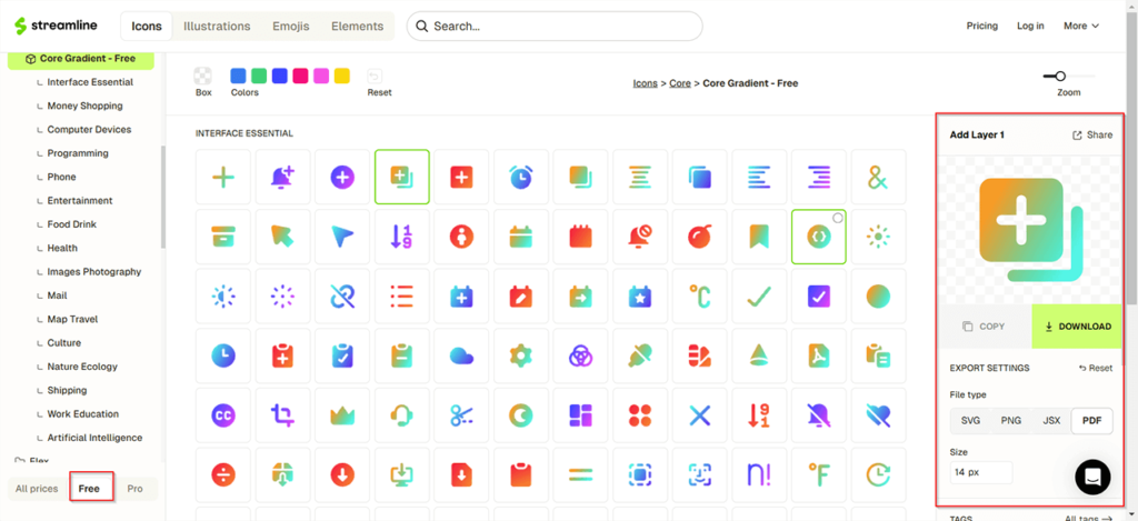 《Streamline》網站裡的內容素材分為免費(Free)和付費(Pro)兩種版本,如上圖,點選左下角來切換版本。它的素材資源包含圖示、插圖、表情符號和元件四大類。網站的使用介面設計得很簡潔、好用,而且免費版本不需要登入就可使用。